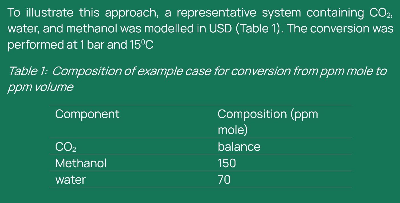 PVT/thermodynamic packages (manual): In cases where commercial simulation tools (like USD) are unavailable or when conversion under non-standard conditions is required, the ppm mole to ppm volume conversion can be performed manually using thermodynamic data. This approach relies on calculating the molar volume of each component in the mixture and applying mole fraction-based scaling to determine individual volume contributions. For this study, we used STFlash, Shell’s internal thermodynamic package, to obtain accurate property data. The conversion was carried out at 1 bar and 15°C, following these steps: