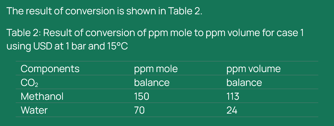 In practice, the choice between ppm mol and ppm vol has a direct impact on calculated concentrations, especially when gas composition, temperature and pressure deviate from simplified assumptions. Reservoir conditions, pipeline transport systems and process units can span wide operating ranges and involve complex gas mixtures that contain impurities and water vapour. Under such conditions, a simple one-to-one substitution between ppm mol and ppm vol is not valid, and inappropriate conversions can introduce discrepancies that reach up to a factor of three (for example composition of CO2, methanol and water) in reported values.