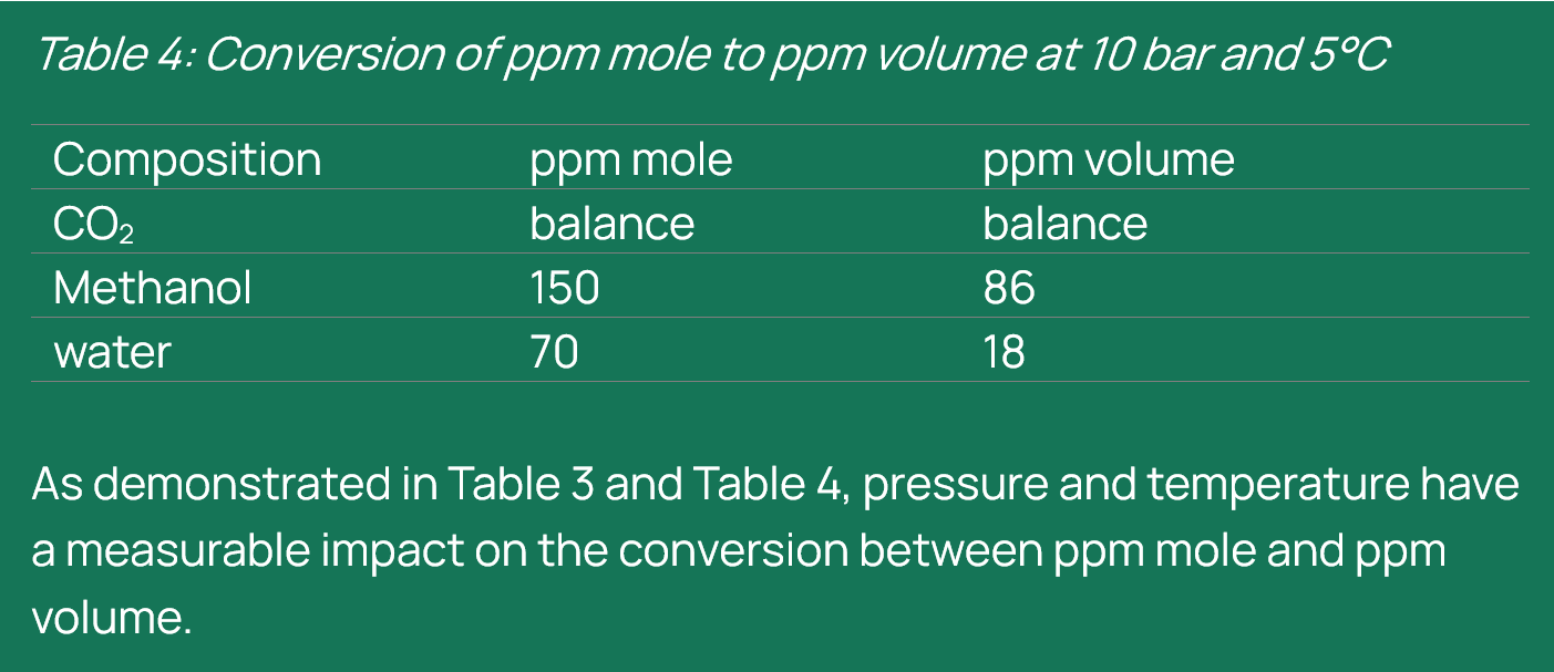 As demonstrated in Table 3 and Table 4, pressure and temperature have a measurable impact on the conversion between ppm mole and ppm volume.